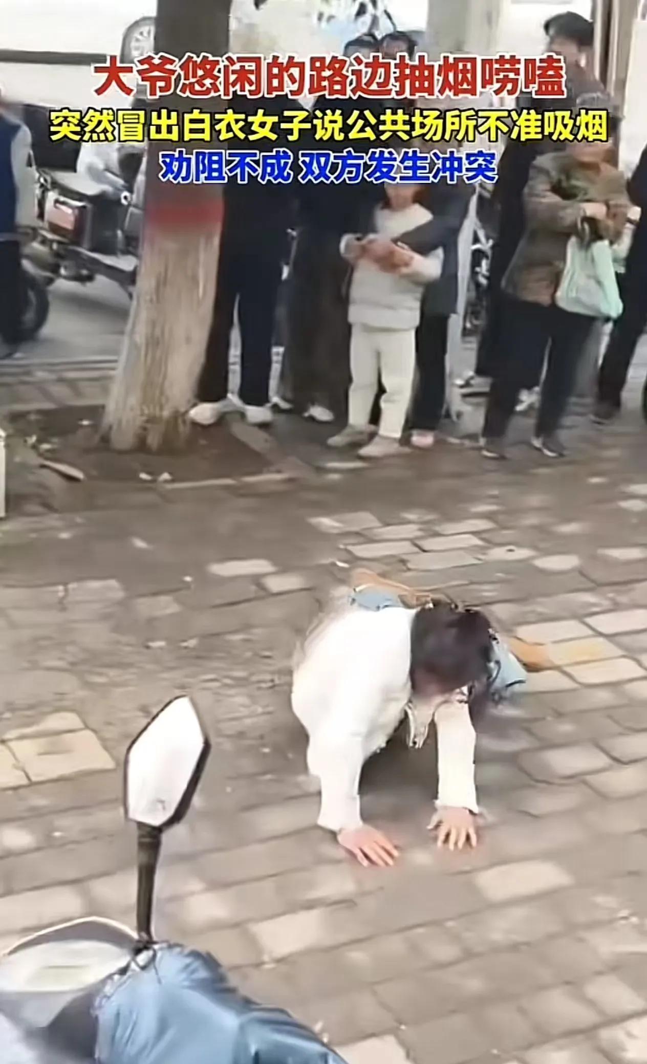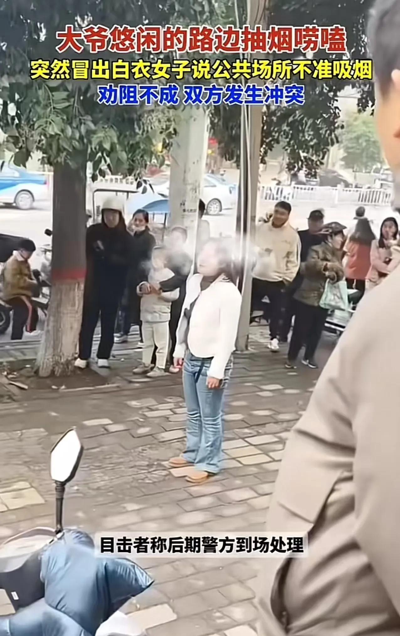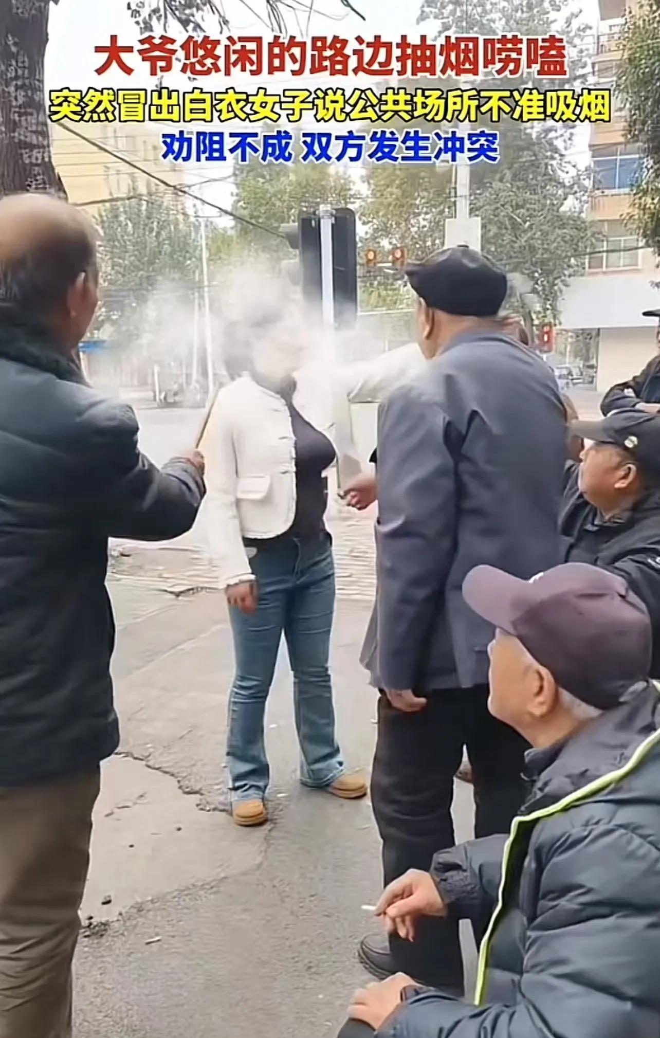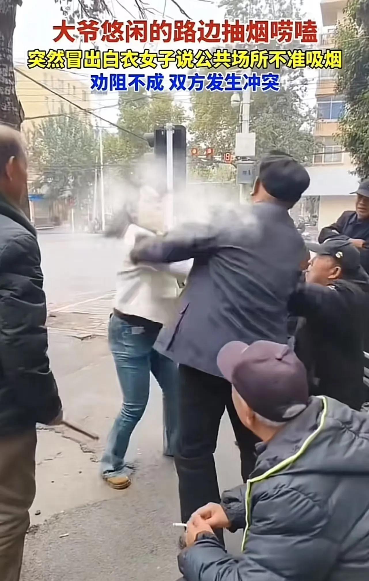 在河南焦作的一条热闹街道上,几位大爷坐在外面的长椅上,边抽烟边聊着天,挺悠闲的。突然,一个姑娘走过来,很不客气地说:“大爷们,这里是公共场所,不能抽烟哦!”大爷们一听,有点懵:“咱这是在户外呢,又不是屋里,抽根烟咋啦?”姑娘可不依不饶:“烟味到处飘,我也难受啊,你们不听,那就别怪我不客气了!”说完,她竟然动手打了其中一位大爷。