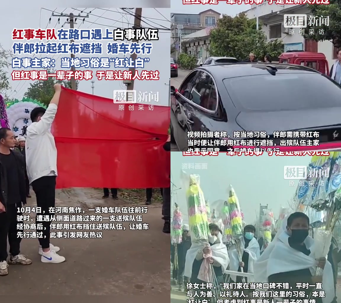 伴郎慌得赶紧扯红布挡,没想到白事主家徐姐直接点头:“让新人先过。”